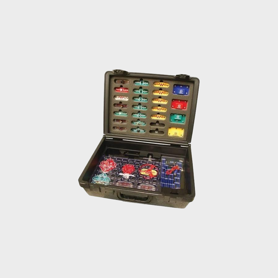 The Model SC-300R is an in-depth exploration of the electronic components included with the SC-300 Snap Circuits. Ideal for use in home schooling middle schools and high schools where students will grasp the basic principles of electronics. Two project books and student guide included. Includes Student Guide Only Teacher guide sold separately. Topics Covered: Resistors Capacitors Transistors Motors Integrated Circuits Series Circuits Parallel Circuits Switches Batteries