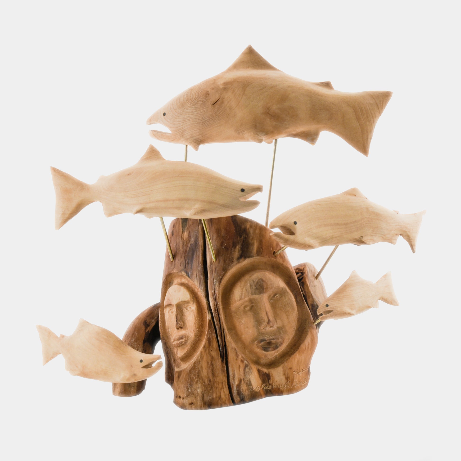 Spruce driftwood sculpture of the five species of Pacific Salmon with baleen eyes, carved by Native Alaskan Inupiaq Artist Anthony Pushruk.