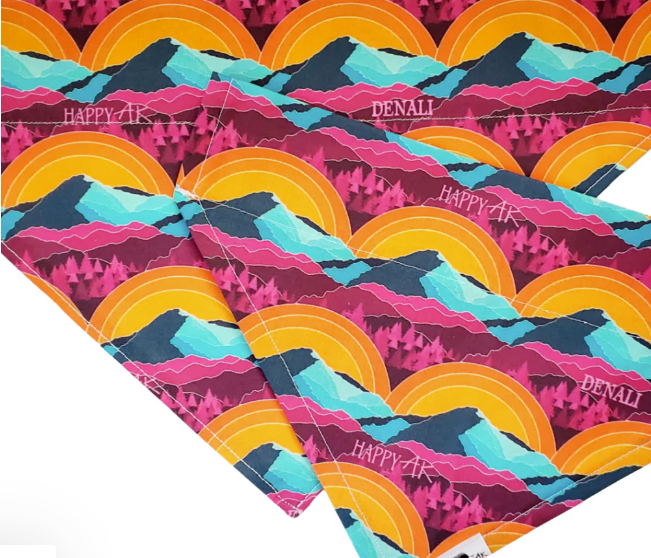 Treat your furry friend to a stylish gift from Alaska with these Happy AK Dog Bandanas. Handmade locally, they perfectly complement your own headbands, creating a fun matching look.