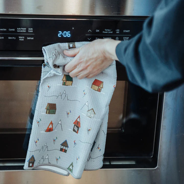 Tea towels with charming themes of Alaskan wildflowers, fireweed, and snow cabins in Girdwood, Labrador Tea's tea towels are made with 80% recycled polyester and 20% polyamide. Each towel measures 20" x 28".
