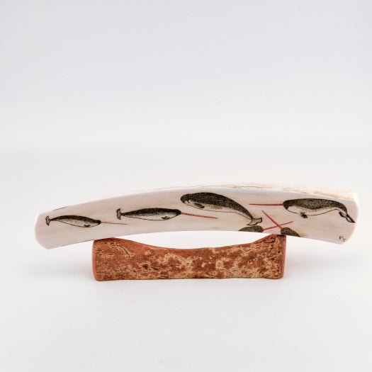 Scrimshaw with narwhal design made from walrus ivory and whalebone. Created by Alaska Native Aleut artist Richard Freeman from Kodiak, Alaska.