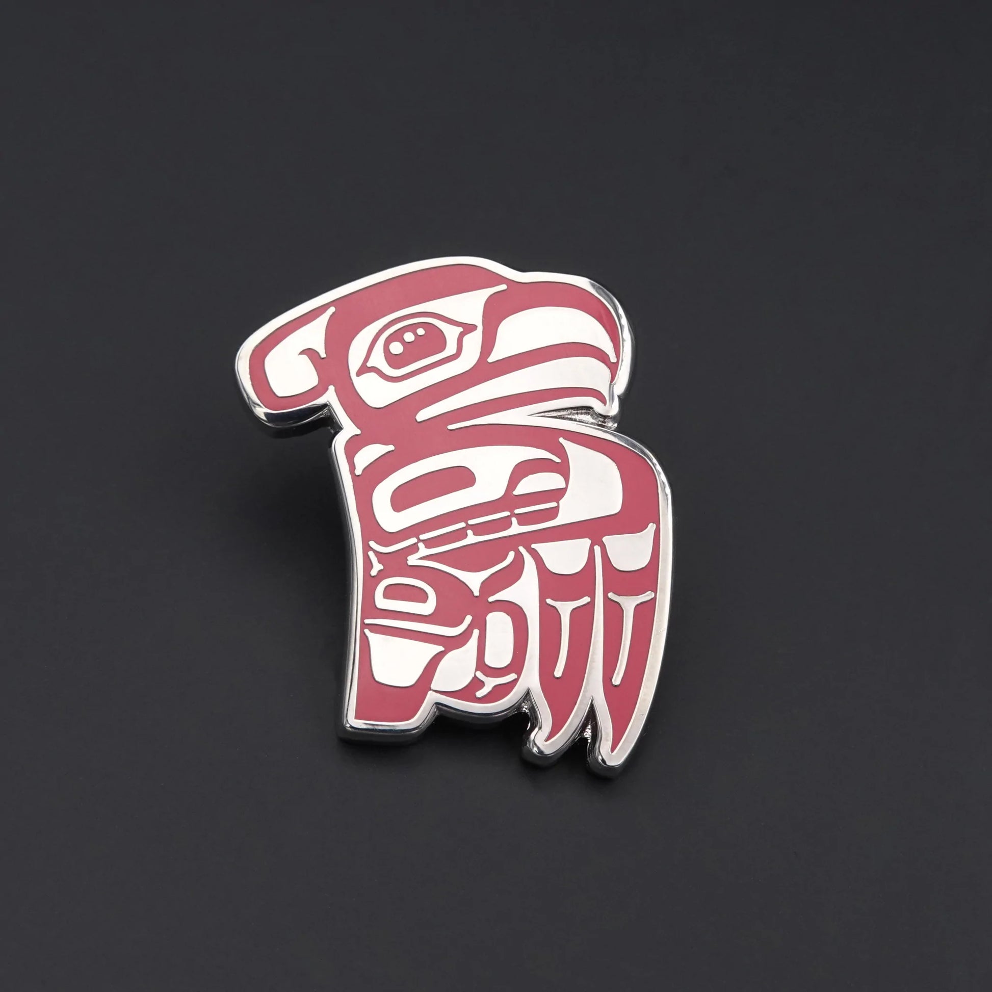 Thunderbird - 1”. Silver chrome finish. Artist Rico Worl made this design for his fiancée. It represents the clan she was adopted by and his father’s clan, the Shangukeidí. Brass pins with bright enamel faces. Comes with rubber backs that are less abrasive on the skin, and individually wrapped in plastic to protect the surface.