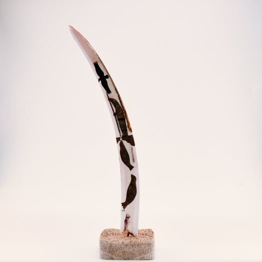 The Hunting Season, Schrimshaw made of ivory on whalebone base, was created by Alaskan Native artist Leon Kinneeveauk.