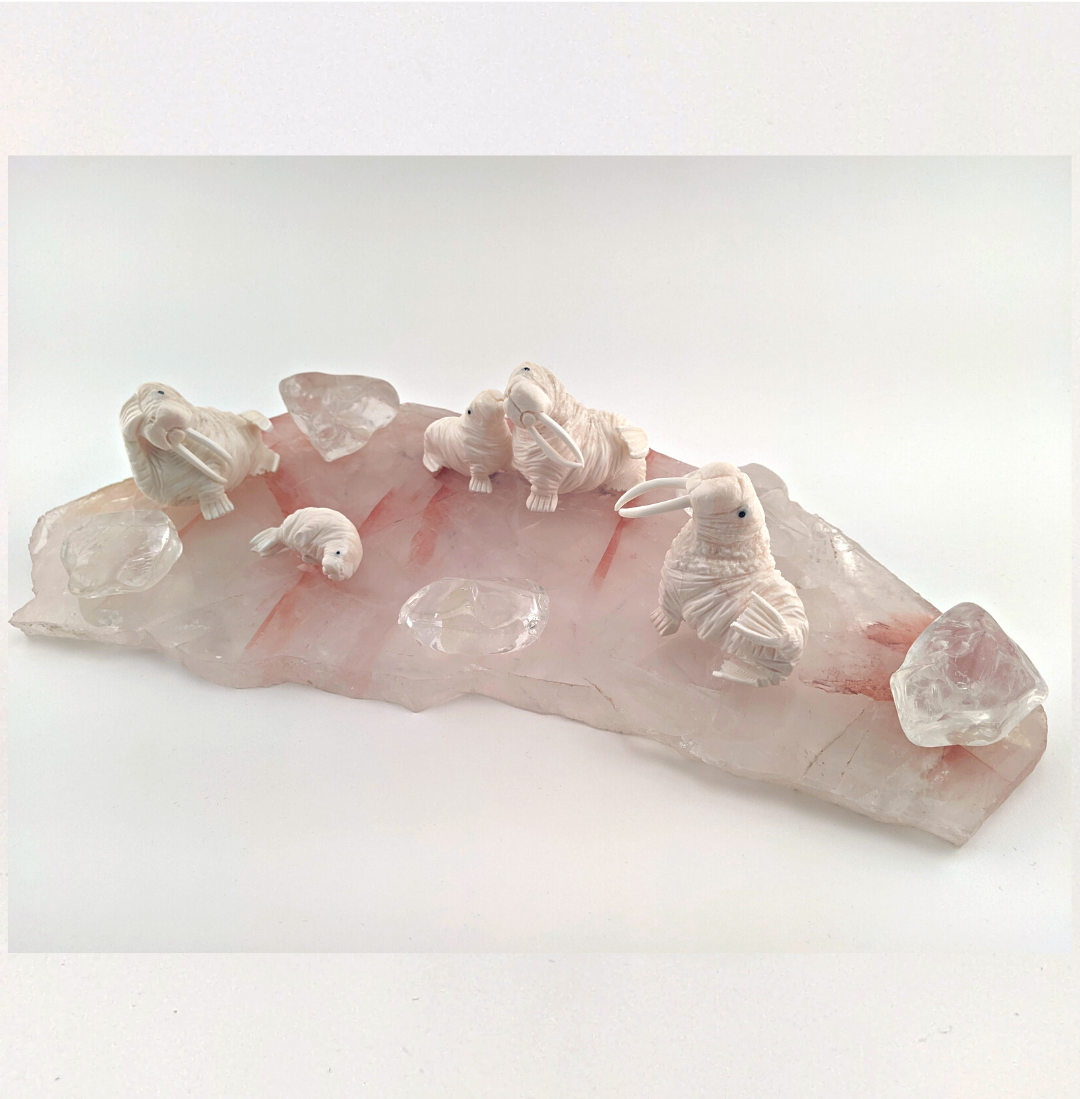 Walrus family made from agate, crystal, walrus ivory and baleen, created by Siberian Yupik Alaska Native artist Dennis Pungowiyi.