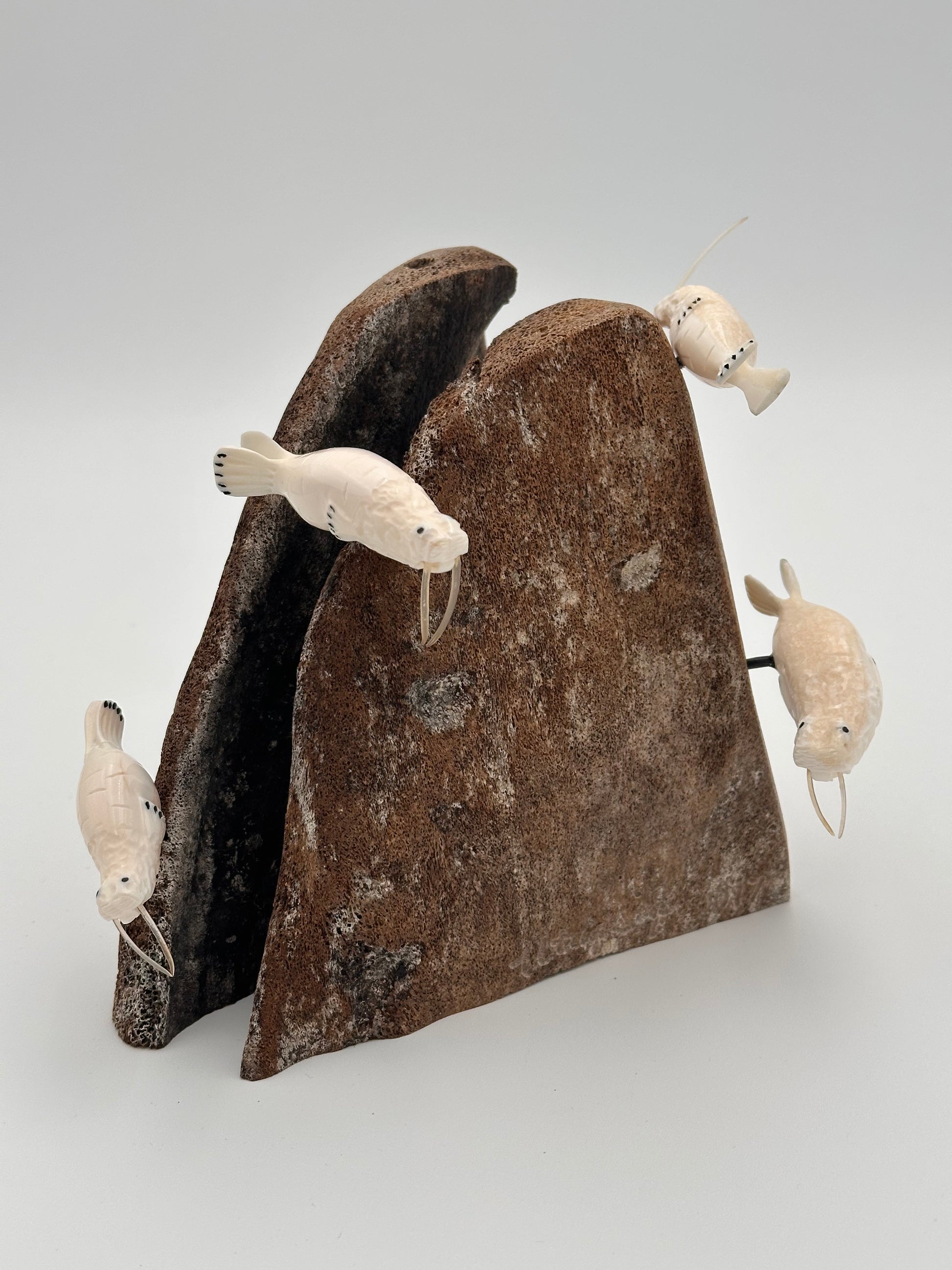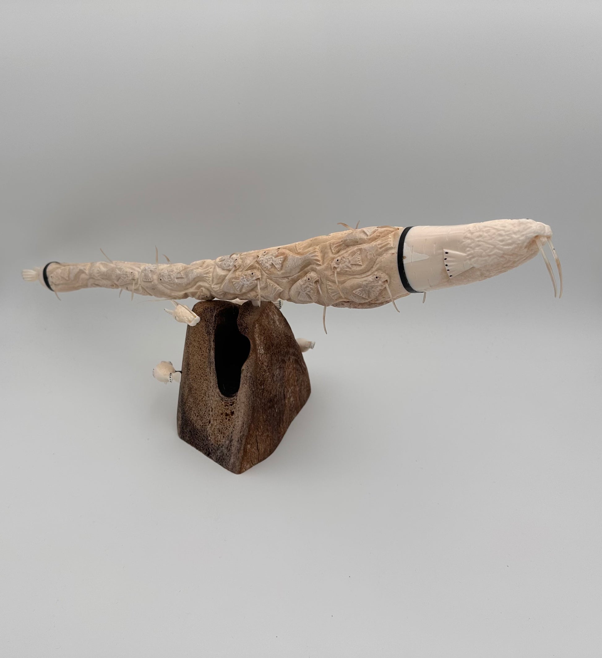 Walrus ivory oosik on a whalebone base has at least 30 hand-carved walruses made with baleen and walrus whiskers for the tusks, created by St. Lawrence Island Alaska Native artist Robert McCoy.